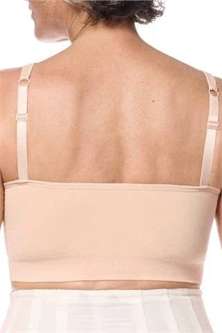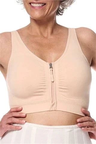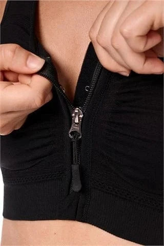 The front of the bra has a zipper closure with a hook-and-eye closure underneath for extra security and ease when dressing and undressing. At the back, there is a Velcro closure to optionally attach a compression belt.