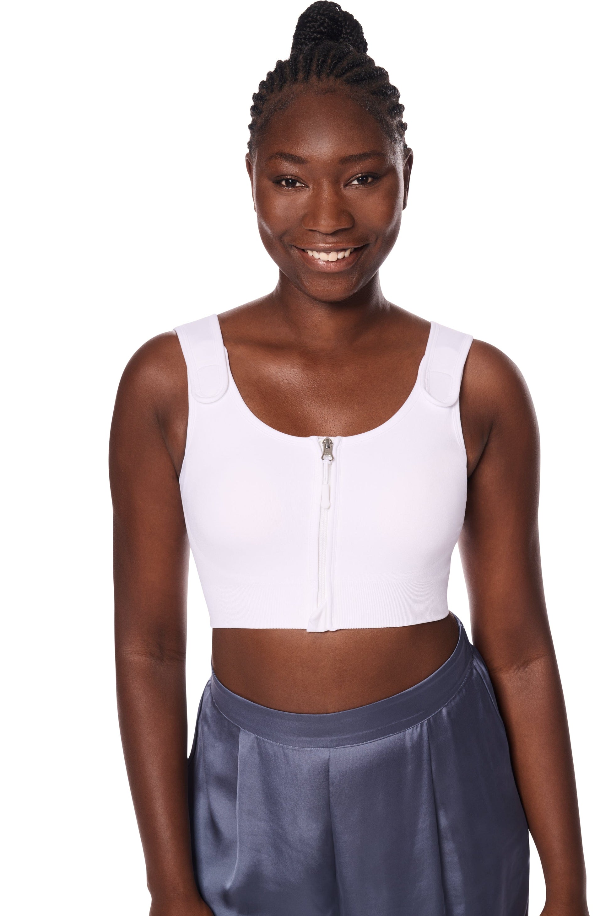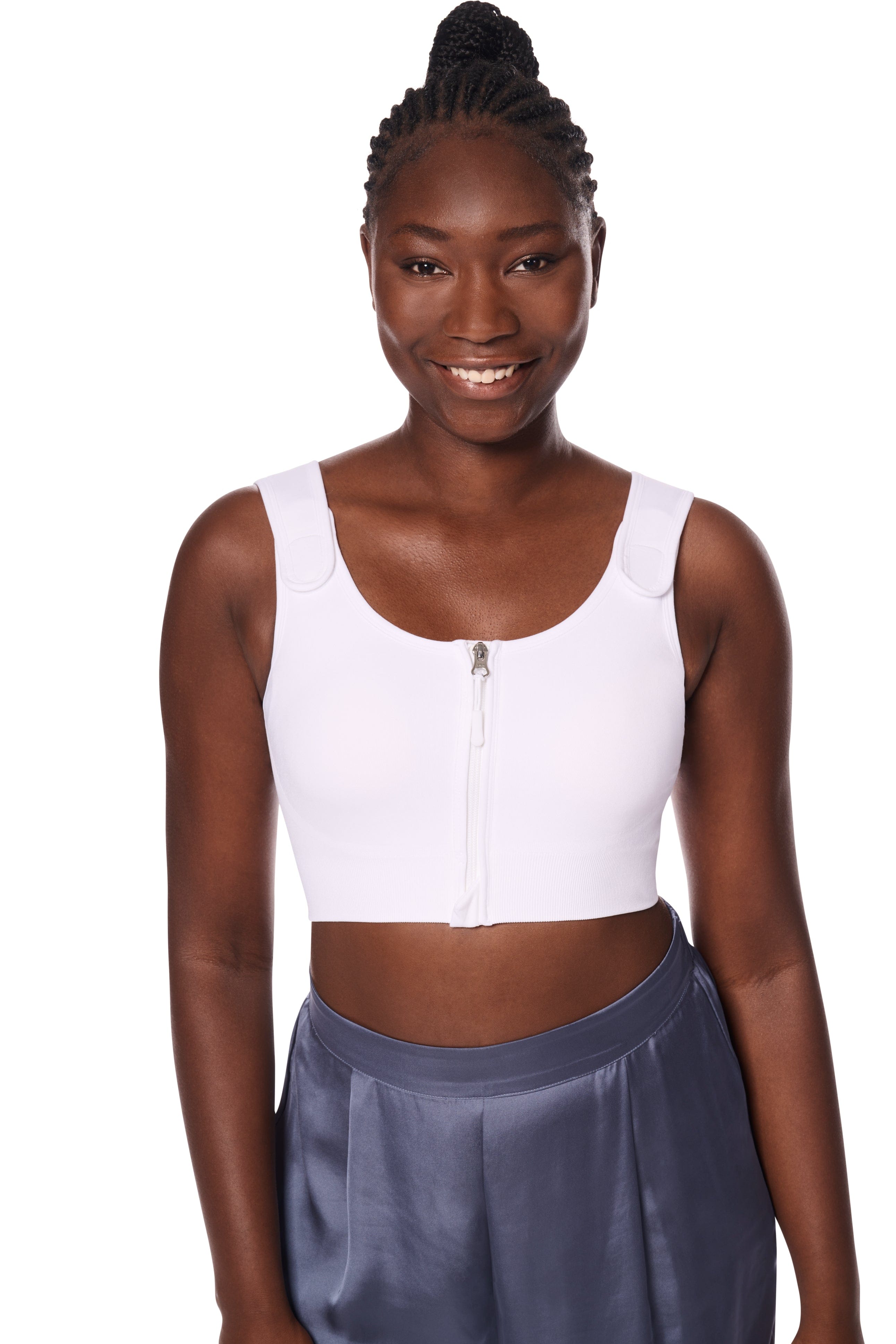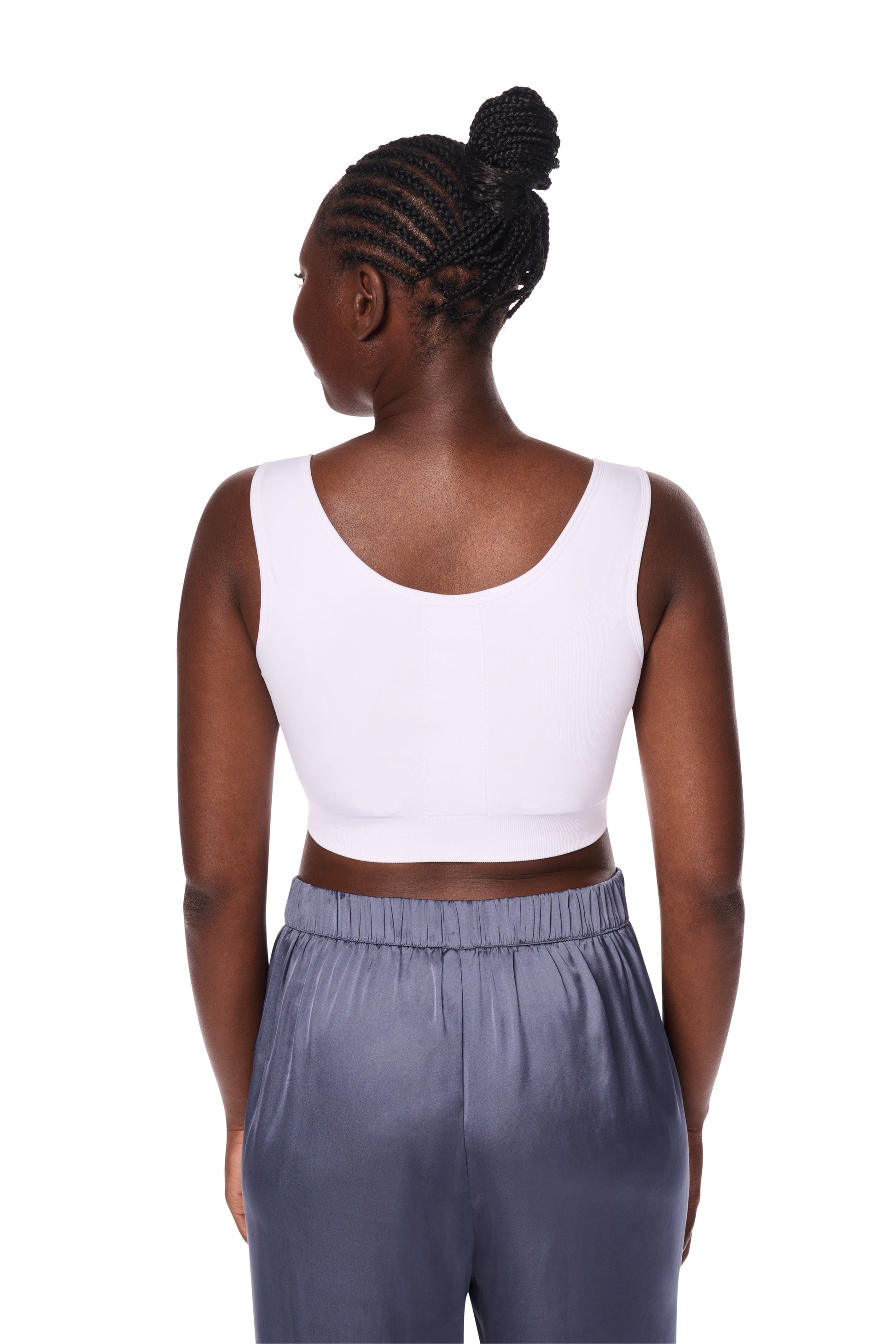 The front features a hook-and-eye closure, making the bra easy to put on and take off and allowing direct access to the surgical area. At the back, there is a Velcro closure suitable for attaching a compression belt if needed.