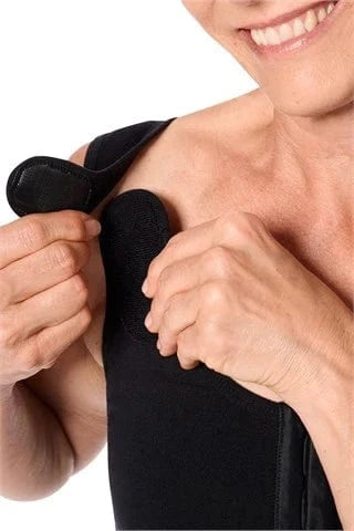 At the front, there is a hook-and-eye closure that facilitates putting on and taking off and allows direct access to the surgical area. The back features a Velcro closure to which a compression strap can be attached if desired.