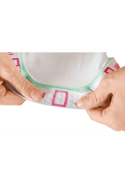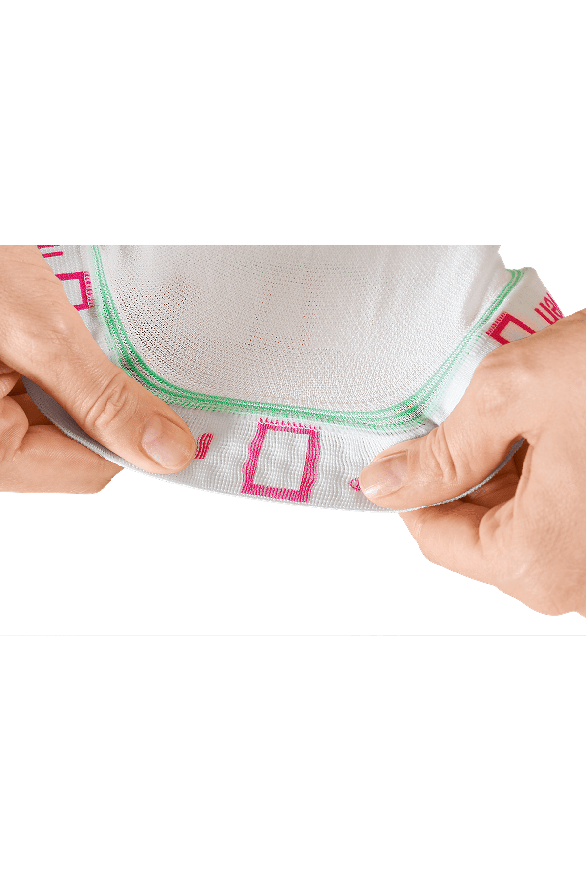 Le bas a une coupe anatomique avec un bord en silicone intelligent qui s'ajuste doucement sans glisser. Le design comprend un talon codé par couleur pour un positionnement correct et une pointe antibactérienne pour une hygiène optimale. L'ouverture d'inspection sous la plante du pied permet un contrôle rapide de la circulation sanguine.