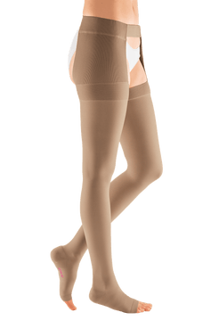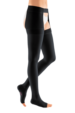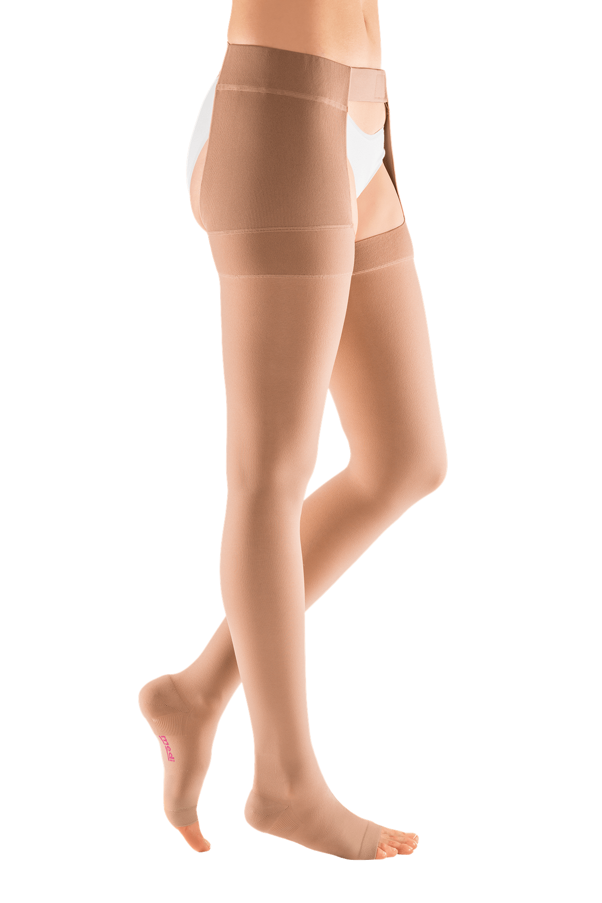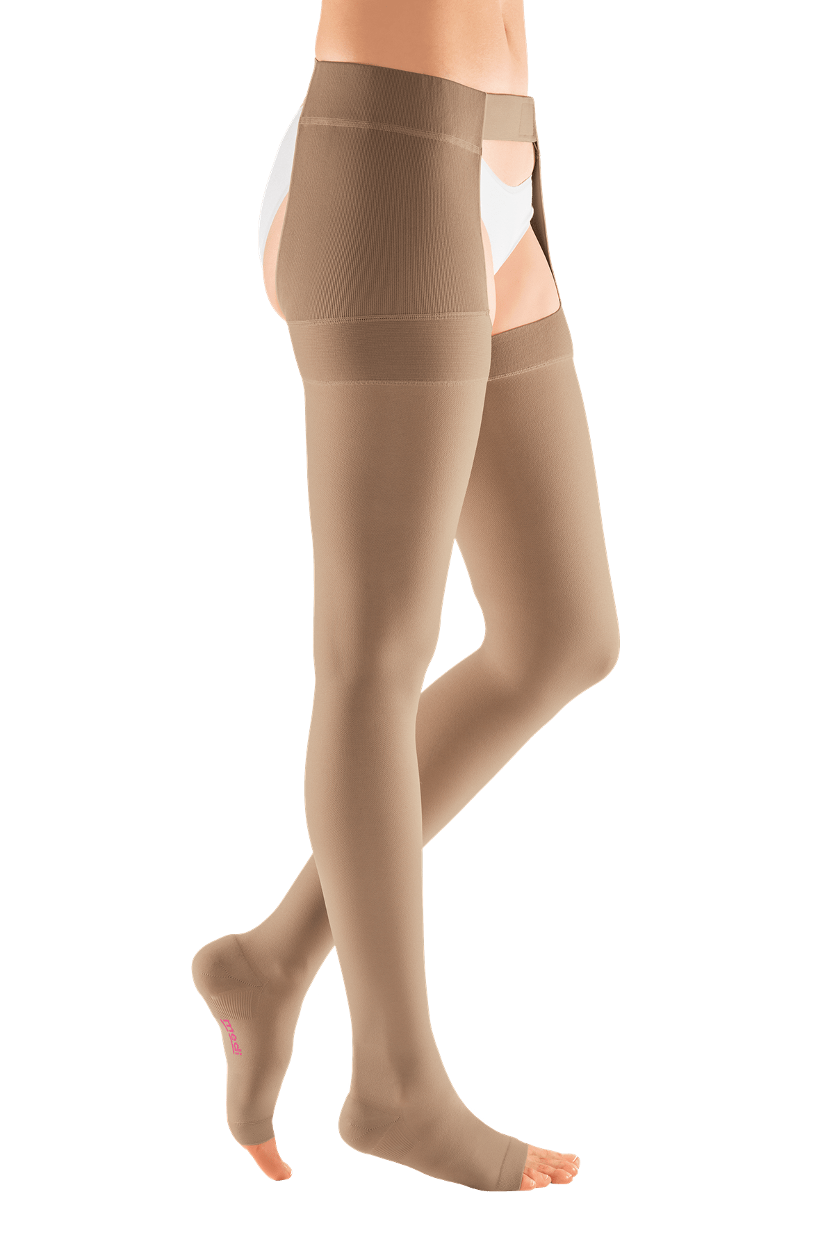 Le Mediven® Plus AGT est fabriqué dans un tricot solide, opaque et résistant à l'usure, offrant une stabilité de compression durable. Le bas possède un talon et une zone plantaire renforcés pour une durabilité accrue. Le bandeau de maintien maintient le bas fermement en place, sans glisser, tout en assurant un ajustement confortable autour de la hanche. Le matériau est respirant, respectueux de la peau et certifié selon la norme OEKO-TEX Standard 100.